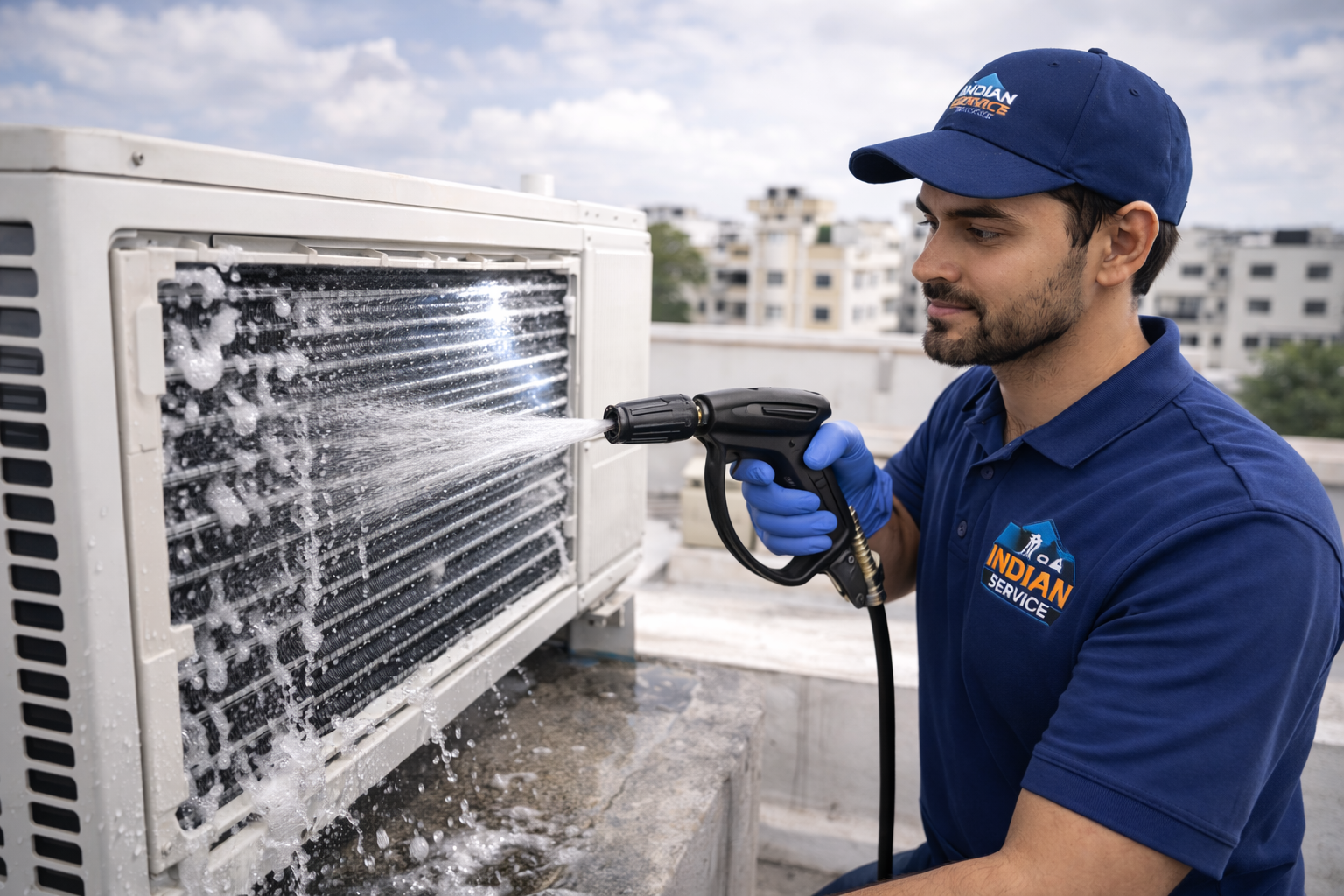 The outdoor unit is cleaned using a high-pressure water wash to remove dust, mud, and blockages, helping the AC release heat efficiently.
